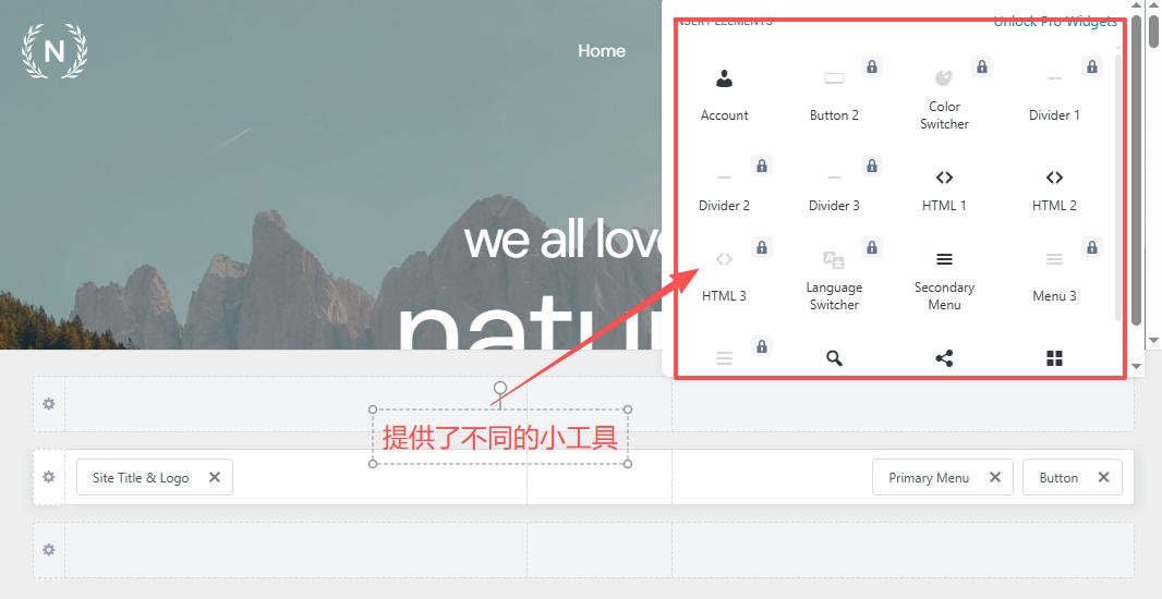 Astra支持页眉和页脚自定义设置,并且提供了三行三列的Header框架。