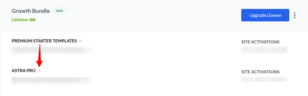 您可以通过 “帐户”>“控制面板”找到您的许可证密钥。在 Astra Pro 插件 ZIP 文件的下方,您可以找到“复制此许可证密钥”的选项。