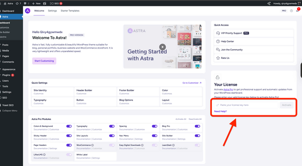 在Astra >仪表板下,您只需粘贴之前复制的许可证密钥即可。