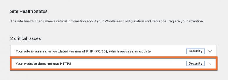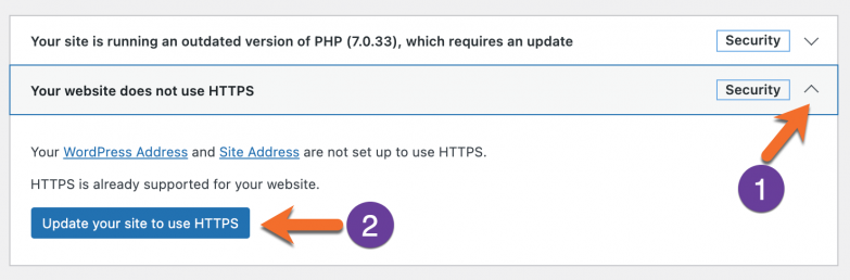 步骤 3)单击有关您的网站未使用 HTTPS 的警告旁边的向下箭头,然后单击标题为“Update your site to use HTTPS”的蓝色按钮。